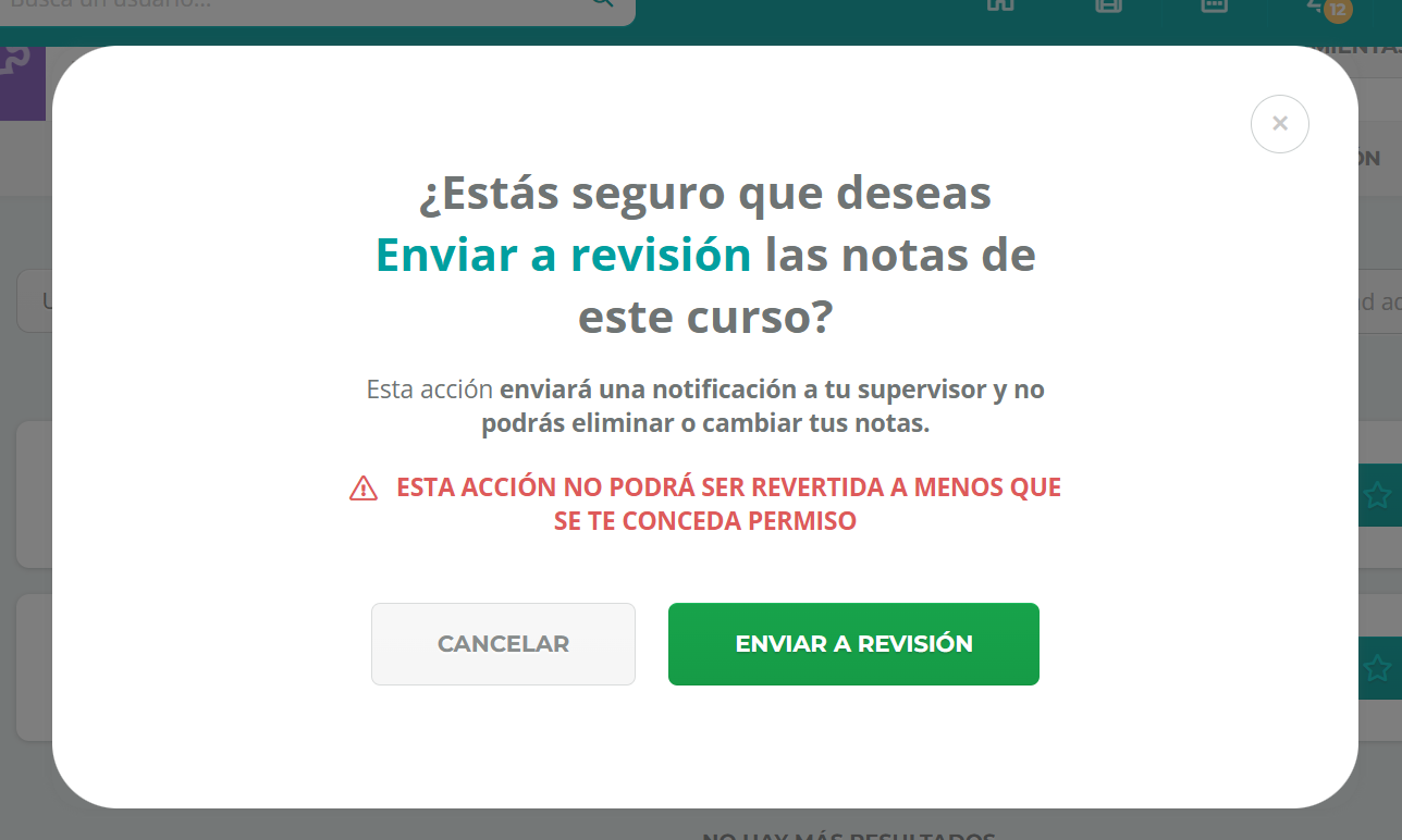 Esto sacará una ventana para confirmar la acción, pues se le notificará al supervisor que se desea hacer un cambio en las notas.