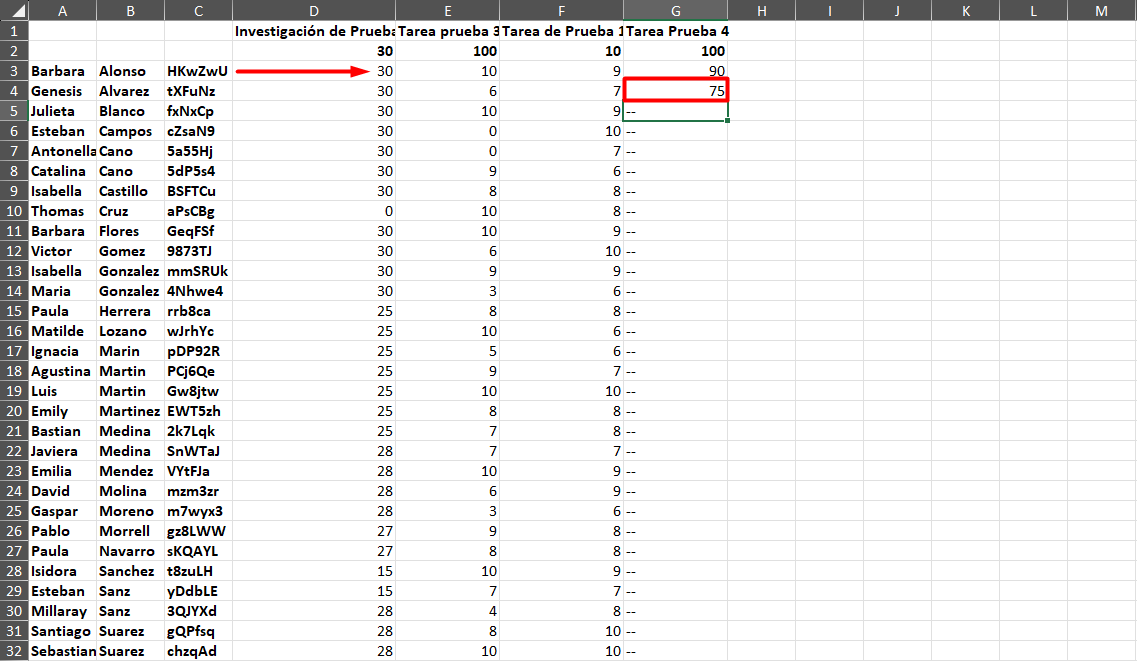 Una vez completada la descarga y se abra el archivo encontrará el nombre, apellido y código de los estudiantes en las primeras columnas, es importante que esta información no se modifique dentro del archivo ya que es la utilizada para asignar correctamente la nota a cada uno de ellos.