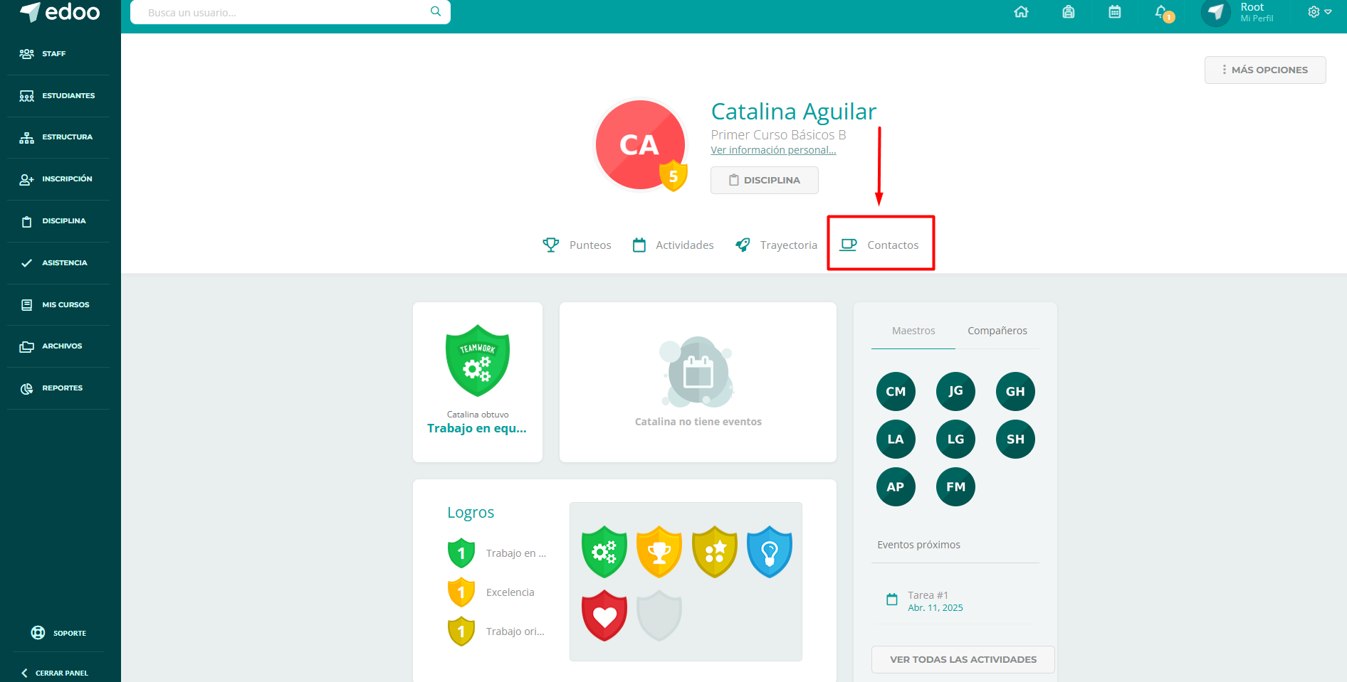 Estos contactos pueden ser localizados desde el perfil del estudiante en el apartado Contactos.
