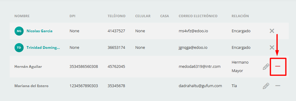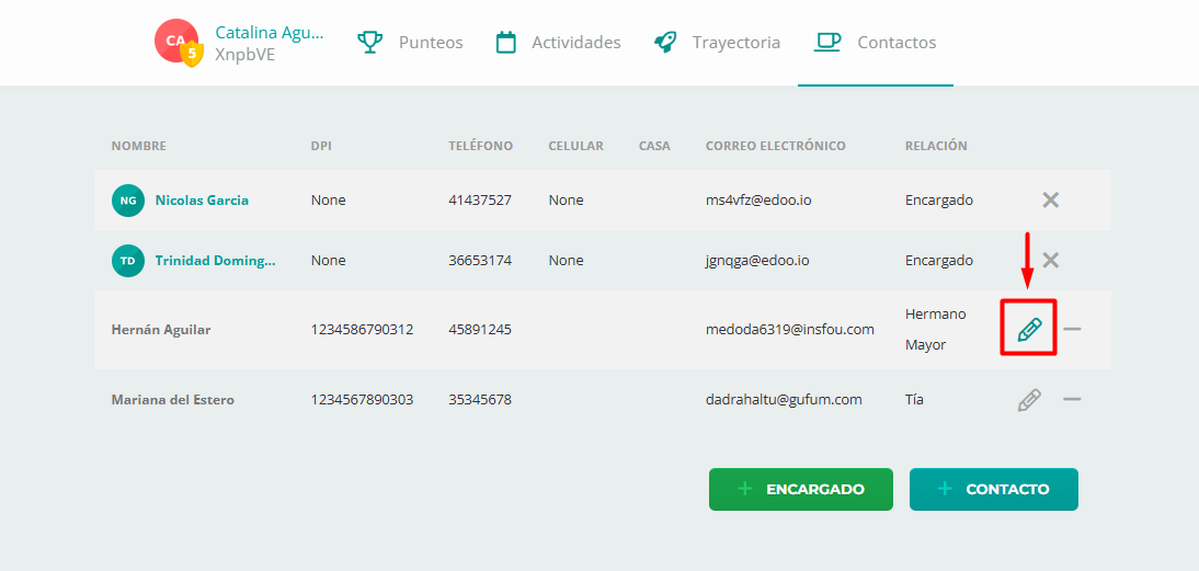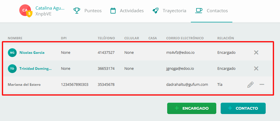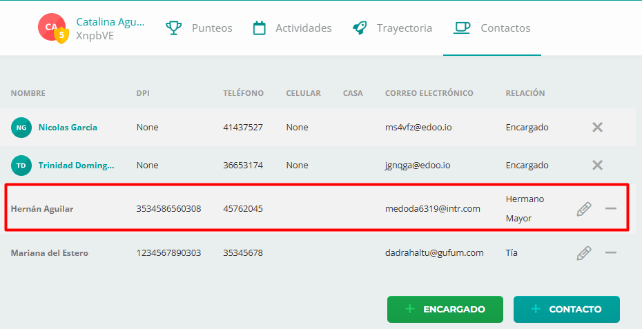Al ingresar al apartado Contactos nos mostrará una lista en donde encontraremos los encargados del estudiante y debajo de ellos podremos ubicar los contactos secundarios como se muestra a continuación: