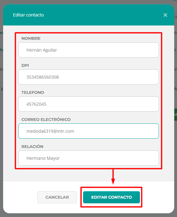 En este apartado se nos permitirá editar los datos y al finalizar podremos seleccionar el botón EDITAR CONTACTO para que los cambios queden grabados correctamente.