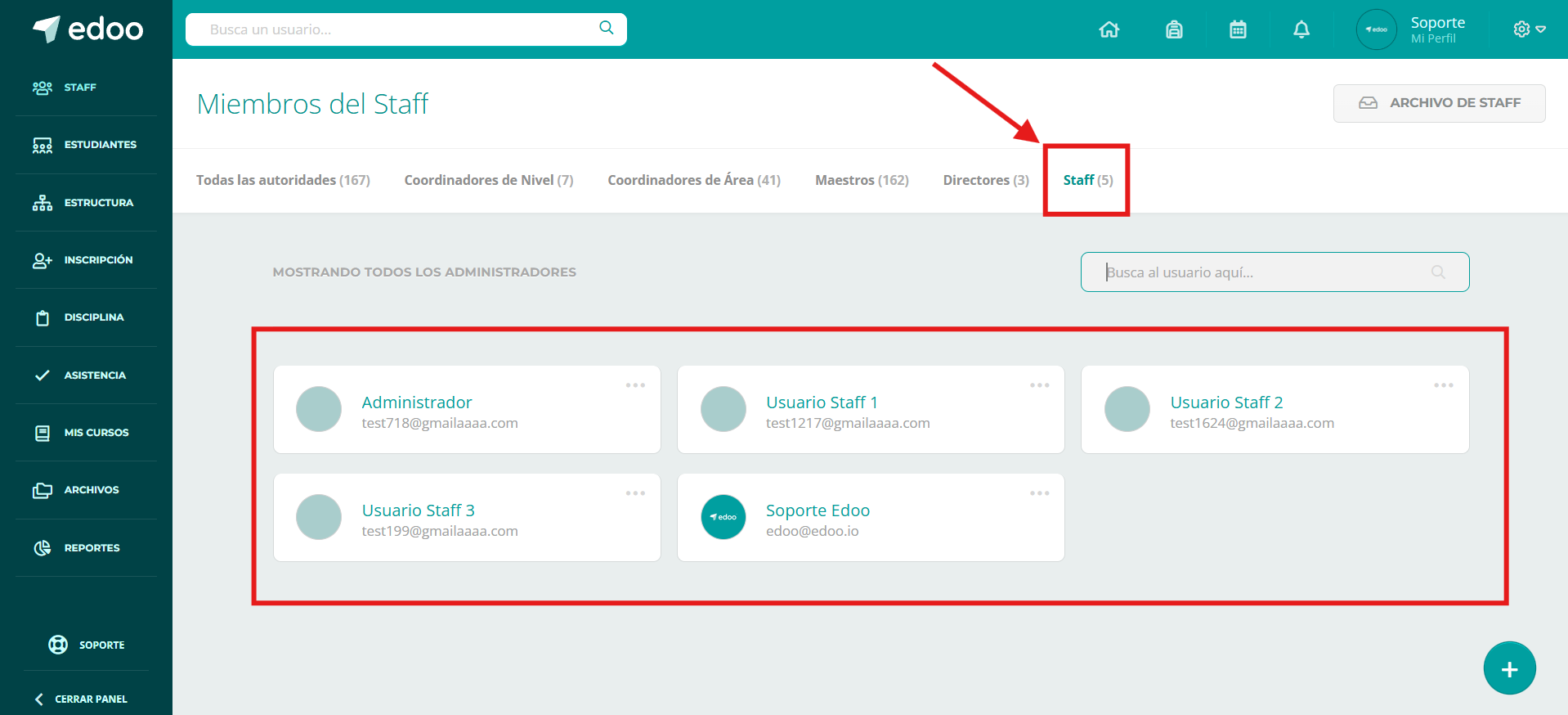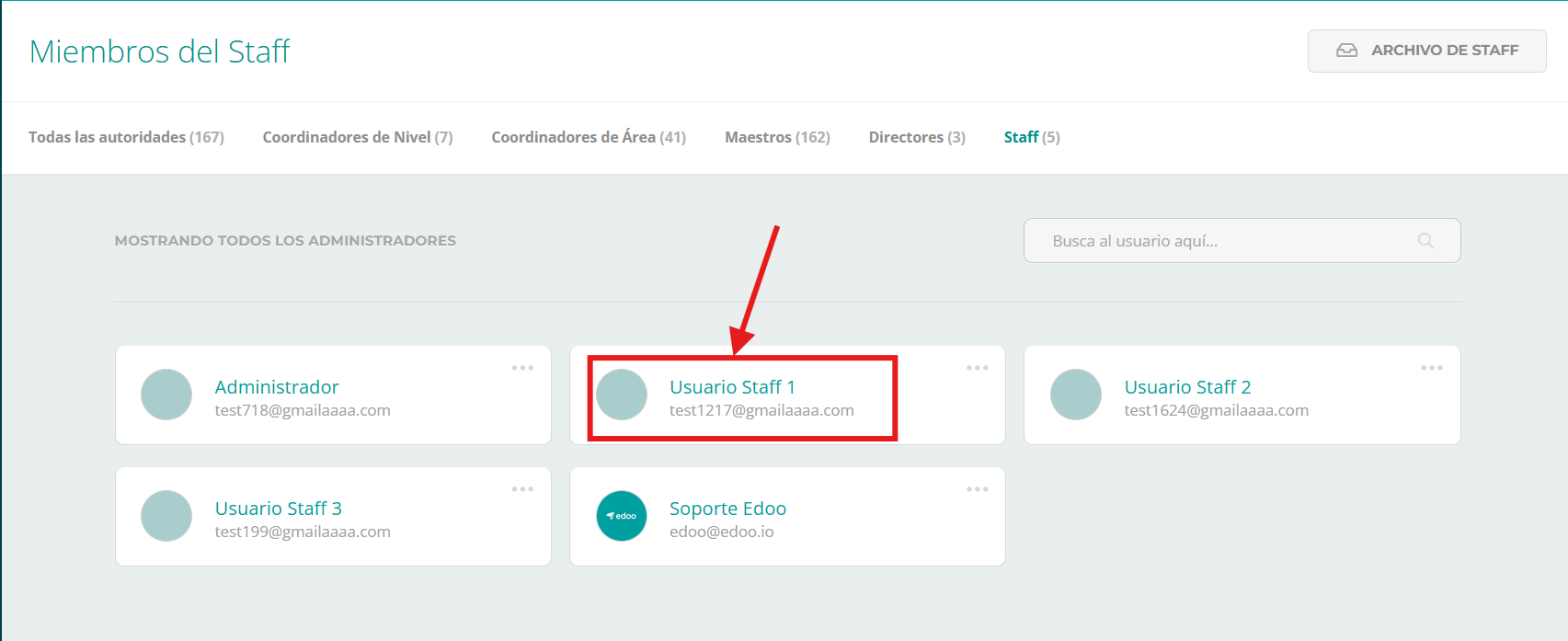 Al seleccionar el filtro Staff se nos presentarán únicamente los usuarios staff con los que cuenta el colegio, seleccionando el usuario a verificar, nos dirigirá al perfil seleccionado y que contendrá la información del mismo.
