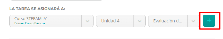 Para dejar la misma tarea a otra sección o curso, se da click en el botón con un signo más (+) que aparece al final de la información que se acaba de seleccionar. Esta acción fijará la información previamente colocada y se desplegará nuevamente un apartado en el que se podrá seleccionar otro curso o sección. Este proceso se puede realizar la cantidad de veces necesarias, a través del botón con el signo más (+).