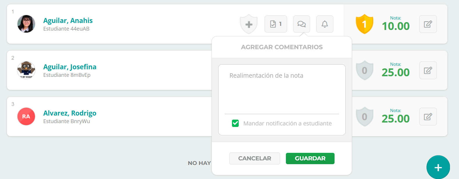 Edoo nos desplegará la información de la tarea y, en la parte de abajo el listado de estudiantes asignados a ese curso. En este listado veremos diferentes opciones, una de estas opciones es un botón con un ícono representado por un gráfico de diálogo.