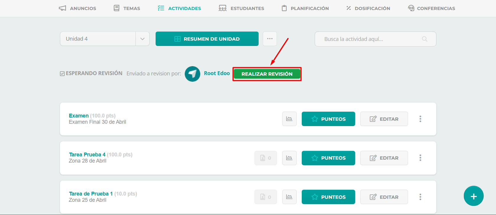 Luego de revisar los punteos y los detalles de las actividades podremos realizar la revisión de los punteos, dando click en el botón de color verde Realizar revisión.