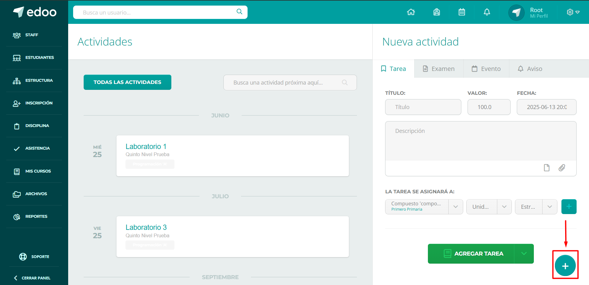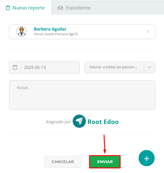 Para realizar una asignación de una falta disciplinaria deberemos ubicar el botón + que se encuentra en la parte inferior derecha de nuestra pantalla, este botón de accesos rápidos se estará mostrando en la mayoría de visualizaciones de Edoo.