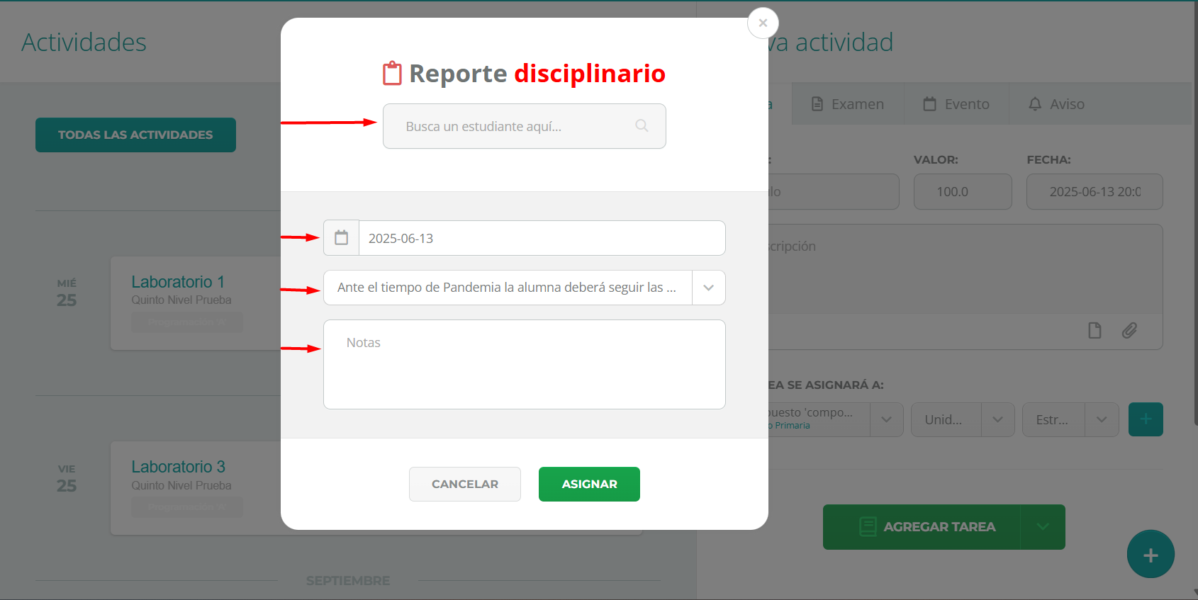 - La fecha en la que deseemos asignar la falta disciplinaria (regularmente seria la fecha del día actual o bien pueden asignar en fechas anteriores).