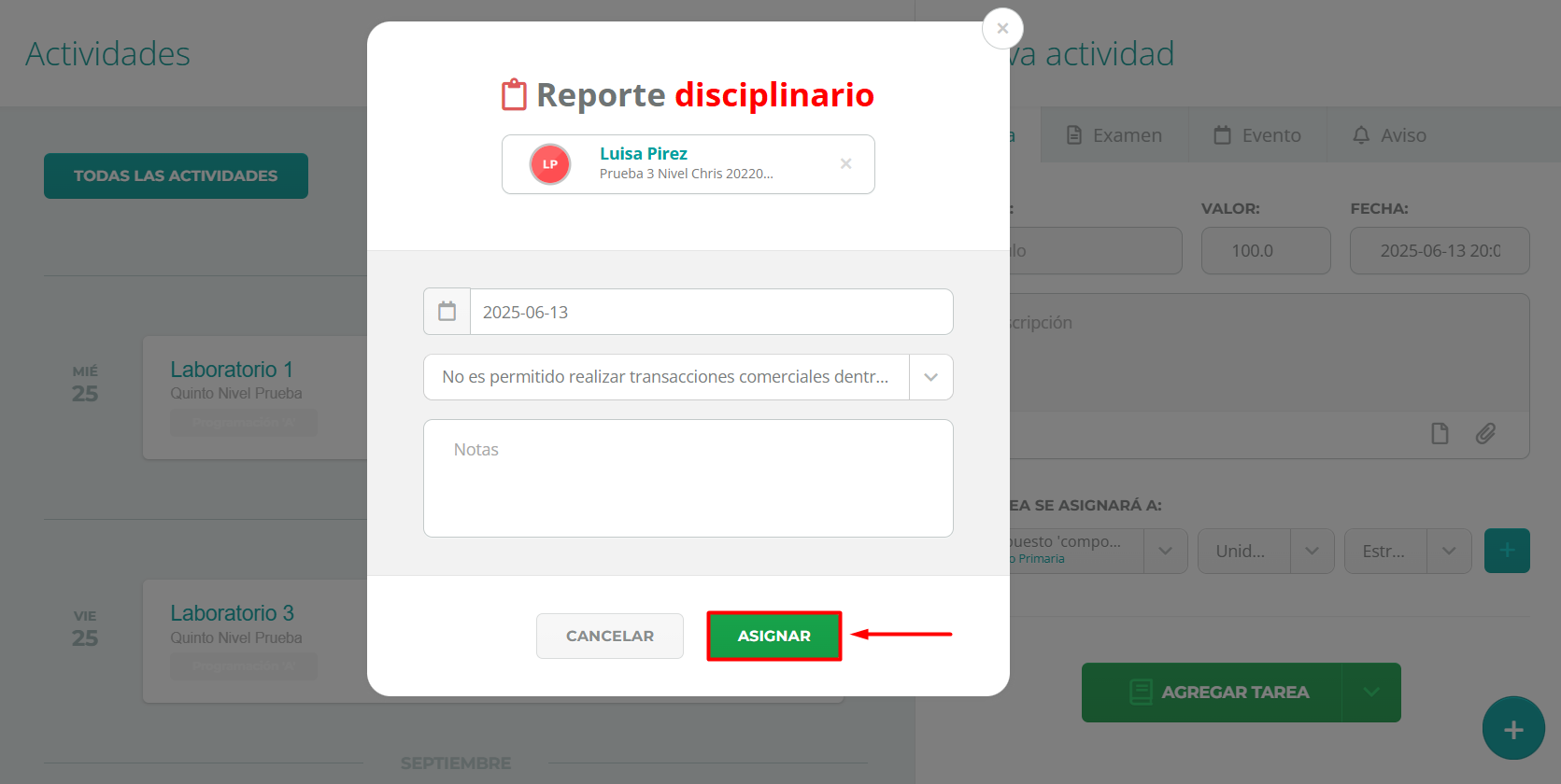 - Agregar notas de ser necesario para ampliar o redactar apuntes adicionales a la falta disciplinaria