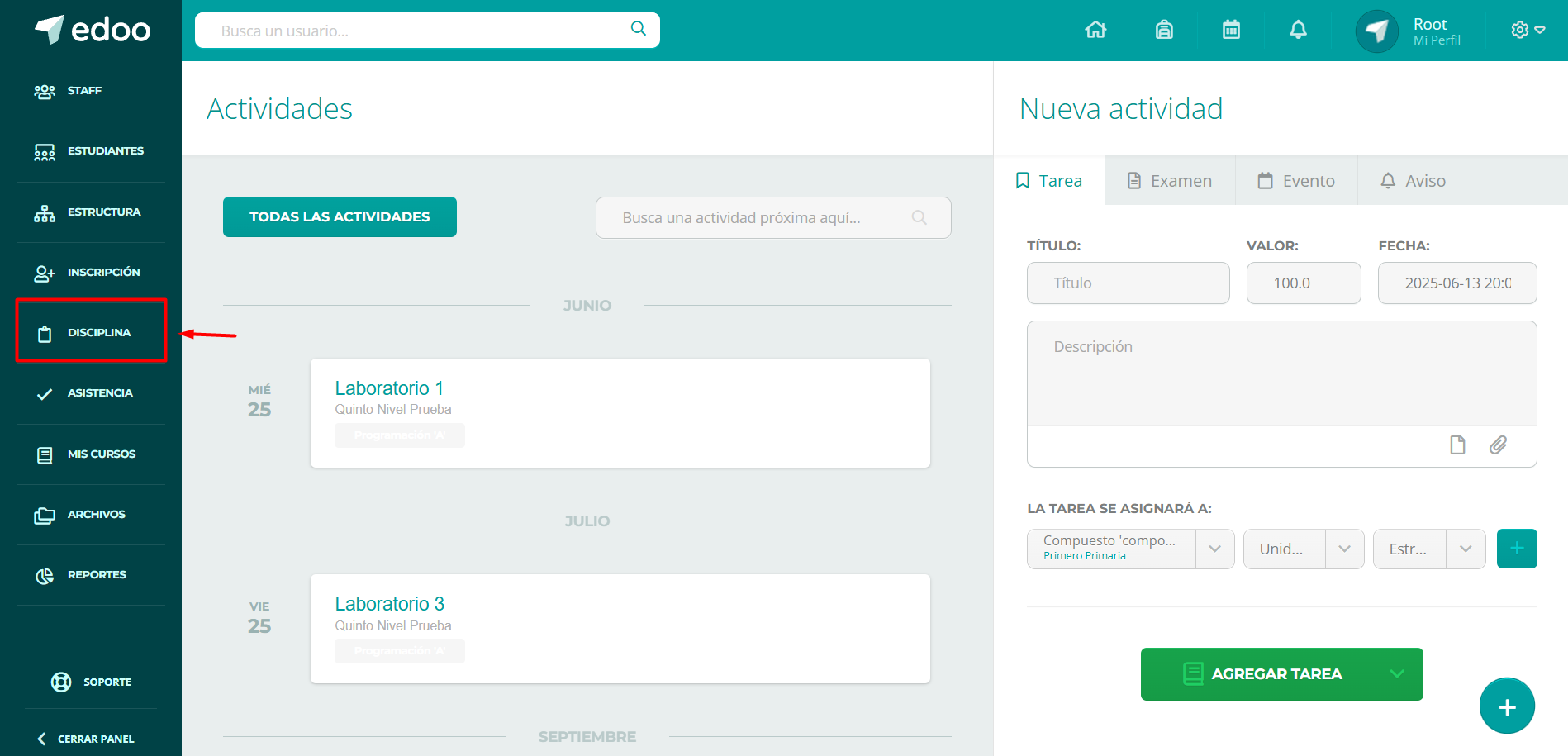 Primero debemos buscar el apartado Disciplina en la barra lateral izquierda de nuestra plataforma.