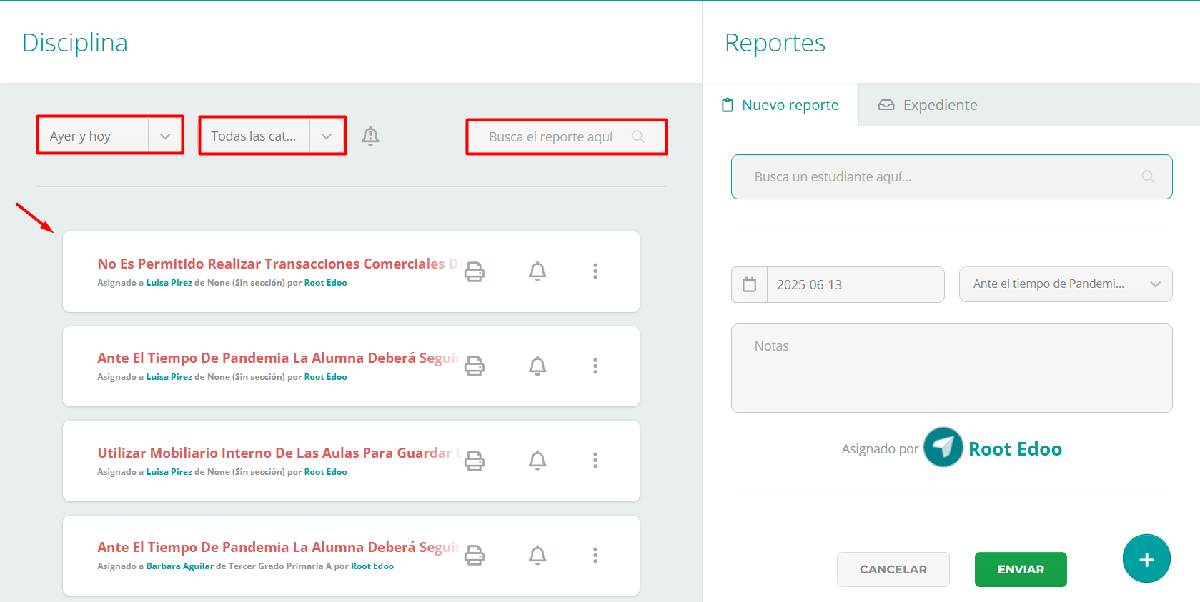 Al dar click en este botón, Edoo desplegará una serie de opciones, donde deberemos seleccionar la opción Reporte Disciplinario.